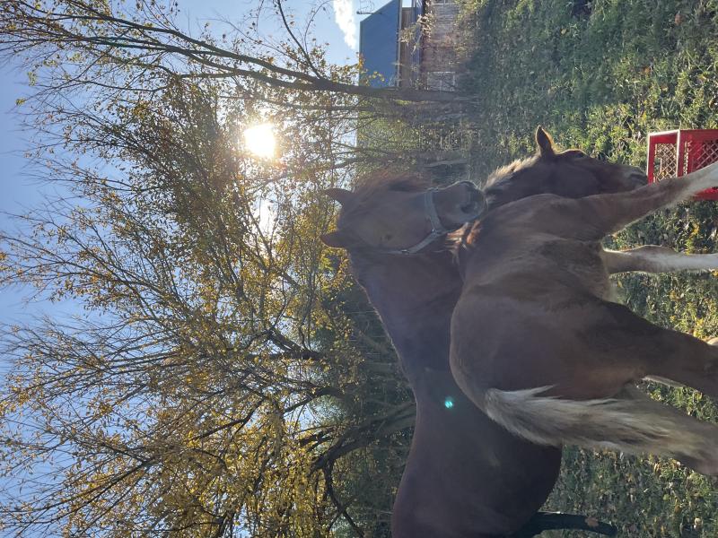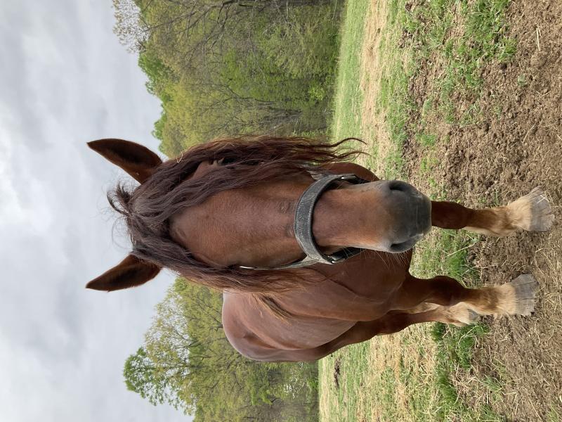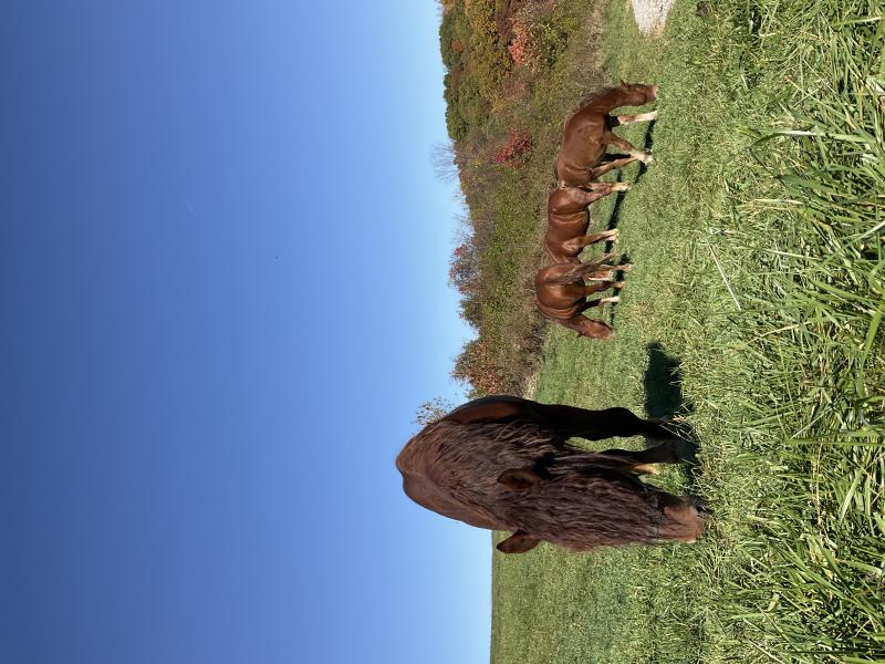 All liver chestnut with no markings and three bilateral whorls on forehead. Just over 16 hands. Very stout and big boned. Out of Ridgewind Rubra ENT 3728-M sired by Eyke Sovereign 3396-S bred by Jason Rutledge of Ridgewind farm. Simon has been our stud since 2018 and has sired 7 foals on our farm. Very calm for a stud and easy to handle